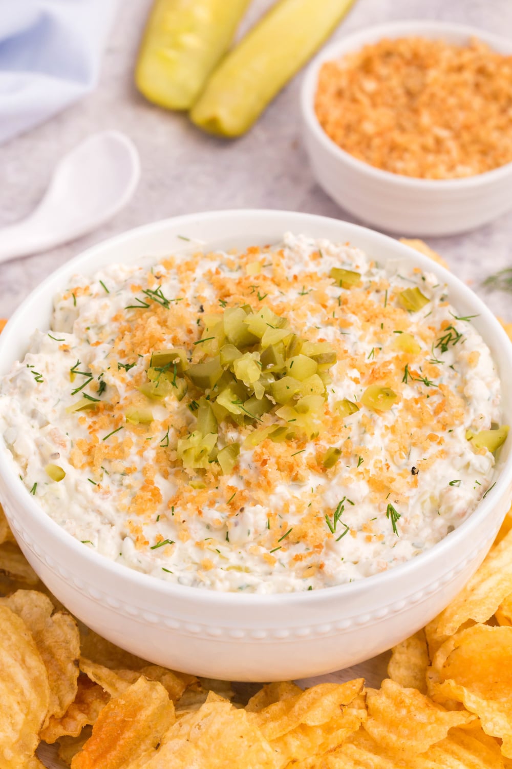 This Fried Pickle Dip is a twist to your favorite appetizer. The velvety pan-fried breadcrumbs and linty dip tastes just like a fried pickle!