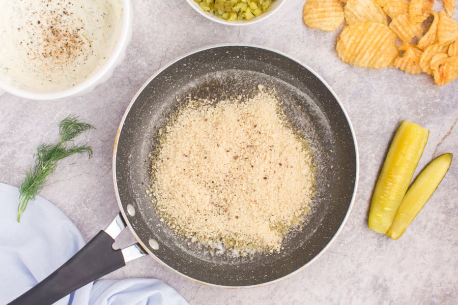 - Use a paper towel to pat your diced pickles to remove glut moisture. Gently fold in your diced pickles and toasted panko crumbs, saving 2 TBSP of panko crumbs for garnish if desired.